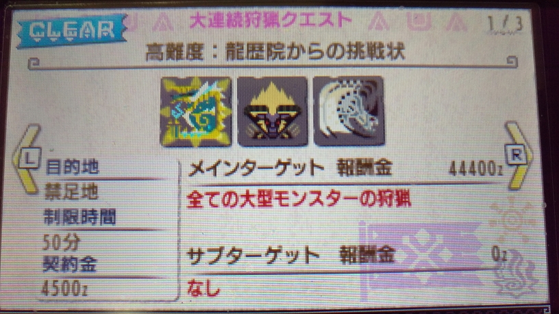 今回も最終盤にいくつか歯ごたえのあるクエストがあったので、攻略メモ的なモノを(ぉ