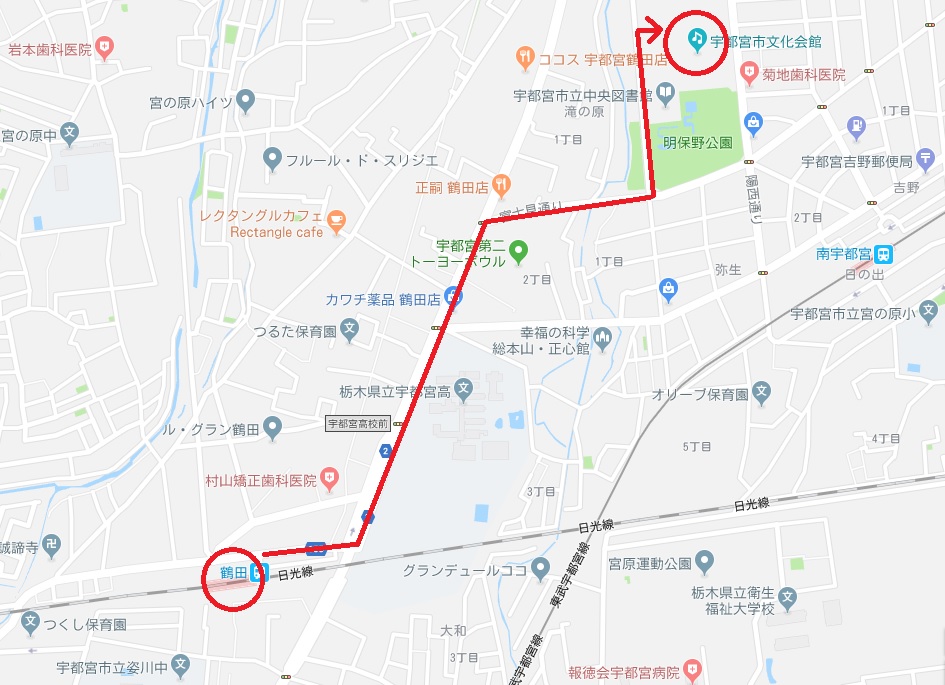 鶴田駅から宇都宮市文化会館までは徒歩約20分(OHP調べ)というギリギリコース。